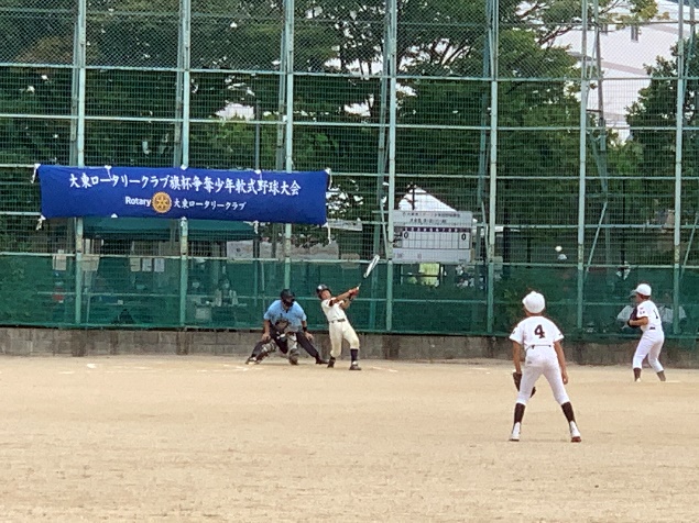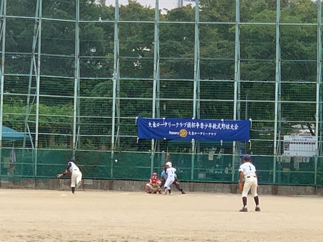 令和2年9月22日(火・祝日)大東公園におきまして、大東ロータリー旗争奪少年野球大会の決勝戦が執り行われました。決勝戦はオール住道と寺川ブラックスのカードで、天候にも恵まれ両チームとも白熱した、好ゲームでした。試合は1回裏にオール住道が2ランホームランで先制すると、2回表に寺川ブラックスがタイムリーヒットで1点を返し反撃、その後両チームともピッチャーの好投、好守備で無得点が続きましたが、終盤オール住道が追加点をあげ勝負あり。3対1でオール住道が優勝、寺川ブラックスが準優勝という結果となりました。