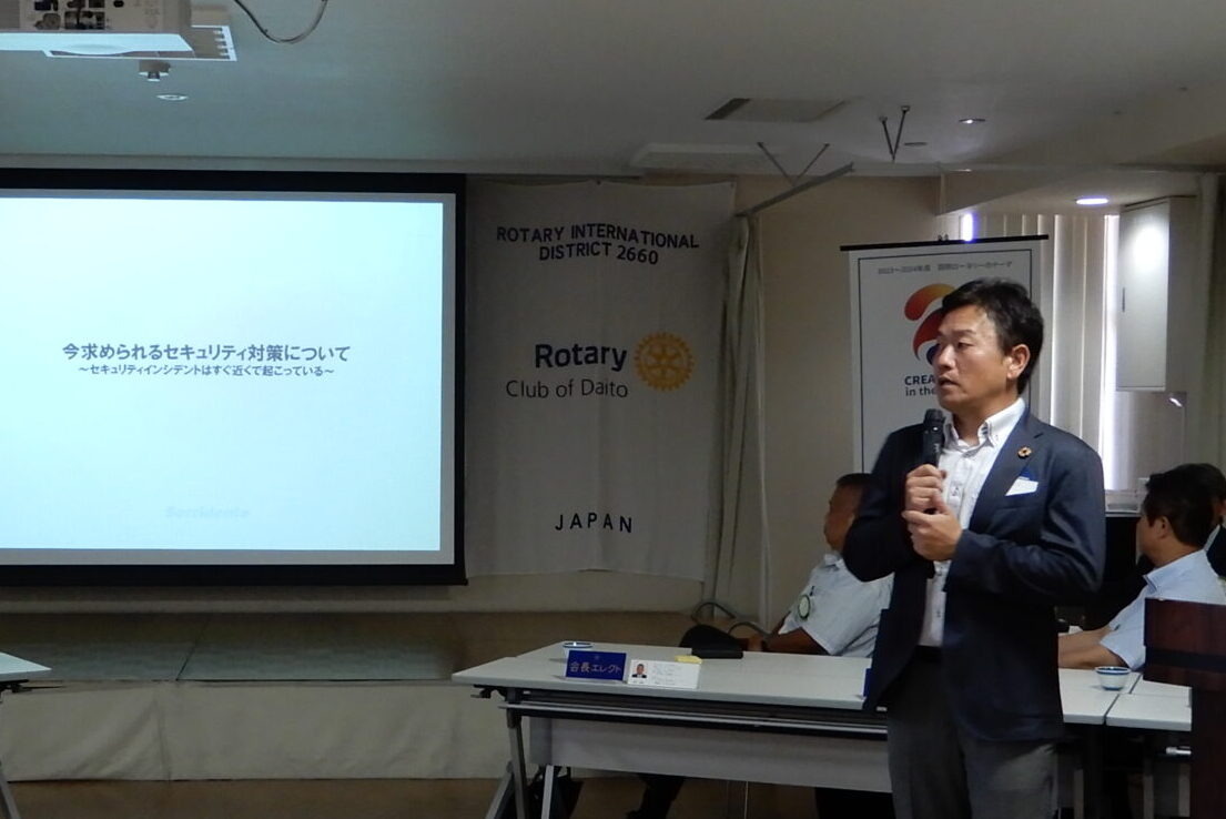 皆様、こんにちは!毎日大変暑い日が続いております。先日、国連のグラレス事務総長が、地球温暖化の時代は終わり、地球沸騰の時代が到来だと警告をされ、本当に深刻な状況になりつつあります。今日の例会が終わりますと、2週間休会となります。お元気でお盆休みをお過ごしいただきます様、祈念申しあげます。本日はゲストスピーカーに㈱ソリデンテの大東正明さんにお越しいただいてます。PC廻りの安全対策のお話をして頂くようです。最近、メールやインターネットに関連するリスクが非常に問題になっていますので、勉強させて頂こうと思います。また、RCへの入会のご検討も頂いてるようなので合わせて、よろしくお願いいたします。