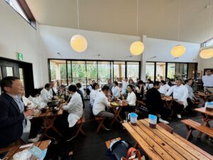 4月2日(火)に日帰りで春の家族会を行いました。朝8時に住道駅を出発し、兵庫県三田市に向かいました。まずはドーバー酒造株式会社様で工場見学を行いました。一般には公開をされていない工場でしたので皆様大変ご興味を持たれ、洋酒やリキュールの事はもちろん、建物の建築様式や物流システムについても真剣に見学をされておりました。その後は桜を見ながら散策をする予定でしたが、今季は残念ながら桜の開花が遅く、満開という訳にはいきませんでした。しかしながら寒緋桜や若干咲き始めたソメイヨシノの前で皆様、笑顔で記念写真を撮られていました。その後、昼食会場の三田バーベキューガーデンズに移動しました。こちらのお店はオーナーが食材等にこだわりをお持ちのところで、なおかつ、食べ方にもこだわりがあり、まずは原木から栽培したシイタケを特製の塩で頂き、その後、国産牛、三田ポーク、名古屋コーチンを特製塩とたれで頂きました。有馬富士を臨む、自然豊かなロケーションで皆様、和気藹々と食事とお酒を楽しんでおられました。その後は全国でも有数の有名店、パティスリーエスコヤマに立ちより、お菓子を購入し、その後めんたいパークでもたくさんのお土産をご購入されていました。最後は山垣畜産さんで東村会長お勧めのコロッケとメンチカツを皆様大量にご購入されておりました。皆様和気藹々と楽しんで頂けたご様子で大変有り難く存じます。ご参加頂きました皆様ありがとうございました。