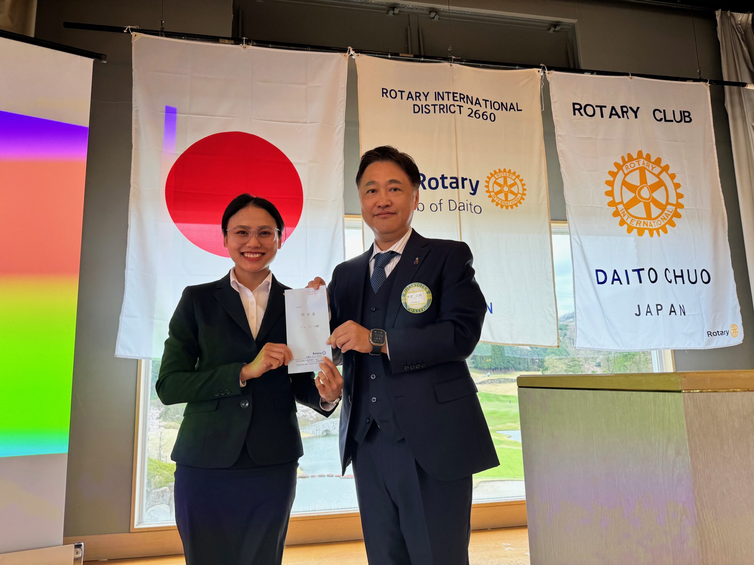 元米山奨学生の蔡 淳安さんが例会にお越しになり、嬉しい近況報告を発表されました。