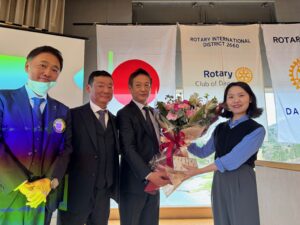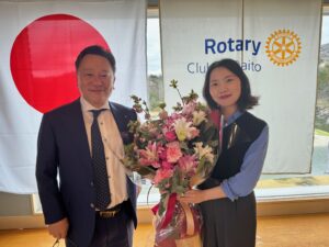 皆様、こんにちは。今年は、桜の開花が遅れていて、今週末あたりが最後の桜の見ごろだと思います、よい時期に合同例会を開催でき嬉しく思います。又先週4月3日におきました台湾東部沖で起きた地震に際し、被災されました方々にお悔やみ見舞いを申し上げ、一日も早い復興をお祈りを申し上げたいと思います。先ほど、例会前の4月理事会で台北雙溪扶輪社を経由して義捐金をすることを承認頂きましたので、早い段階で内容を決めて義捐金の支援をしていこうと思います。メンバーの皆様、よろしくお願いいたします。さて、2023-24年度の大東RCの第56代会長を務めています。東村正剛です。早いもので入会して17年になりました。どうぞよろしくお願いいたします。米山奨学生の紹介 マイさん、クインさん、そして元米山奨学生のサイさんようこそ例会へ。後程それぞれ報告お願いします。そして、燦々会では、いつも青田会長・岩本幹事にはお世話になり、ありがとうございます。