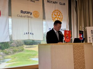 大東RCでは、昨年度定款を一部変更し、会員増強を目的とした準会員制度をつくり、少しハードルを下げ、お試しで1年間会員になって頂くようにしました、ただ正会員で入会頂くのが本筋ではあります。又、大東RCでは多様性の時代に対応する為女性会員についても入会できるようにしました。本年度は、“笑顔で和気藹々”をスローガンに、会員増強を最大のミッションとし、活動をしています。9ケ月を終え、2人の会員を増強できましたが、なかなか難しい問題ですね。ネガティブな話をするのは好きではありませんが、人口減少、長引く景気低迷で、数年後には、RC自体がかなり減少するということは、安に想像できます。今後は、2クラブが一緒になる?なんてことも視野に入れながら、今までタブーだった事も検討したほうがよいかもしれませんね・・・。もともとは、ゴルフコンペからはじまってますので、コンペを再開し、親睦をさらに深めるなんてこともよいかもしれないですね。合同例会第一回の卓話は、“21世紀のキーワードは「人権」と「環境」”というテーマで杉岡五郎様が卓話をされていました。まさに現代のSDGsに繋がる卓話をされていました。今日は、大東RCの重鎮、岡本会員による“この地域のあゆみ”という内容の卓話です。どんな話が聞けるのか、楽しみにしています。以上、会長の時間を終わります。本日も、“笑顔で和気藹々”の雰囲気でよろしくお願いいたします。