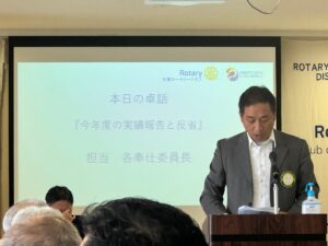 さて、本日の卓話から、各委員長さんの今年度の実績報告と反省になってまいります。残りあとわずかとなってまいりましたが、気を抜かずに会長の時間を務めさせていただきますので、宜しくお願いいたします。