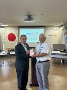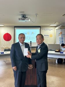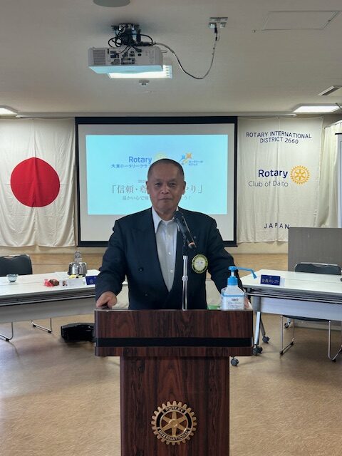 さて、熱く繰り広げましたフランスパリ・オリンピックも8月11日、盛況のうちに終幕を迎え、金メダル数は2021東京大会の過去最多の27個には届きませんでしたが、1964東京大会、2004アテネ大会の16個を上回り20個を獲得しました。 メダル総数でも2021東京大会の58個には届かないにしても2004リオ大会の41個を上回り45個と金メダル獲得数と共に海外開催大会としては過去最高いうことですので立派な結果を残したものと思います。次は28日よりパラリンピックということになりますが引き続き検討をお祈りいたしたいと思います。スポーツの話でいいますと本年で第45回を迎える大東ロータリー旗争奪少年野球大会も来月に控えております。本日は中村会長、竹田事務局長にお越しいただいております。過去多くの甲子園児またプロ野球選手を輩出しているこの大会、大東ロータリークラブも後援しておりますがこの大会が益々地元の少年たちにとって、青少年の健全育成に繋がればよいと思います。