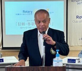 野球といいますと、大東ロータリークラブといたしましても今週末9月1日、第45回大東ロータリー旗杯争奪少年野球大会が開催されます。1980年から始まったこの大会からも先ほどの甲子園に出場した選手や、更にはプロ野球選手も多く輩出していると聞いております。このことから青少年の健全育成に繋がっていると実感できる事業です。これからもこの事業を通して努力や向上心、フェアプレイの精神を培い仲間や指導者とのかかわりを通してコミュニケーション能力を養い、豊かな心と他人に対しての思いやりや支えてくれている方々への感謝の気持ちを学んでいっていただきたいと願います。