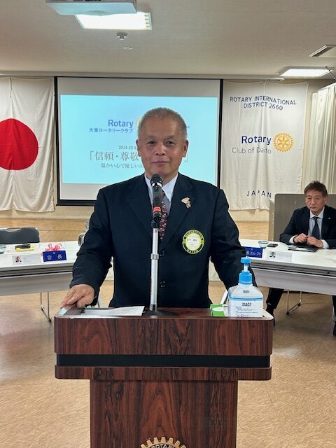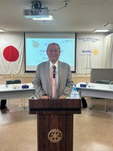 皆さんこんにちは。本日は岡田ガバナー補佐にお越しいただいております。岡田ガバナー補佐よろしくお願いいたします。また本日の卓話に藤田平様にお越しいただいております。当クラブの会員の皆さんも毎年恒例となっているこの卓話を楽しみにしております。藤田様本日は宜しくお願い申し上げます。