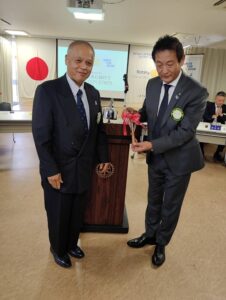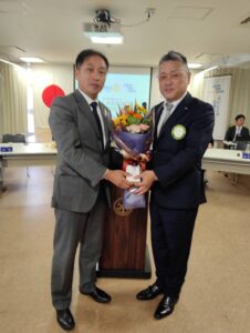 前年度の空門会長、中野隆二幹事への花束贈呈およびバッジ進呈がおこなわれました。