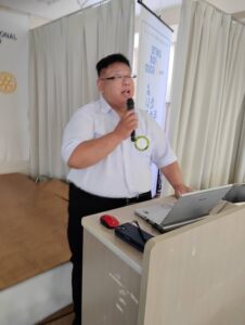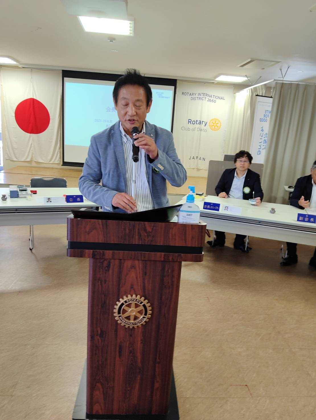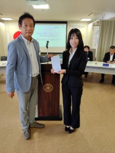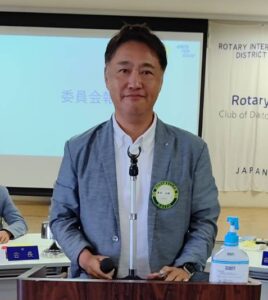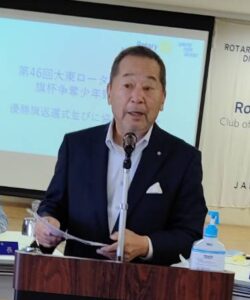 皆様こんにちは!本日は大東市スポーツ少年団会長の中村様、事務局長の竹田様がお越しくださっております。この後、贈呈式と優勝旗返還がございます。宜しくお願い致します。実は、事務局長竹田様の息子さんは横浜DeNAベイスターズの竹田祐投手であります。8月16日に初登板 初勝利を成し遂げられました。おめでとうございます。また米山奨学生グェン・ティ・トムさんがご参加いただいております。後程、近況報告で夏休みのお話などもして頂けるかと思います。宜しくお願い致します。