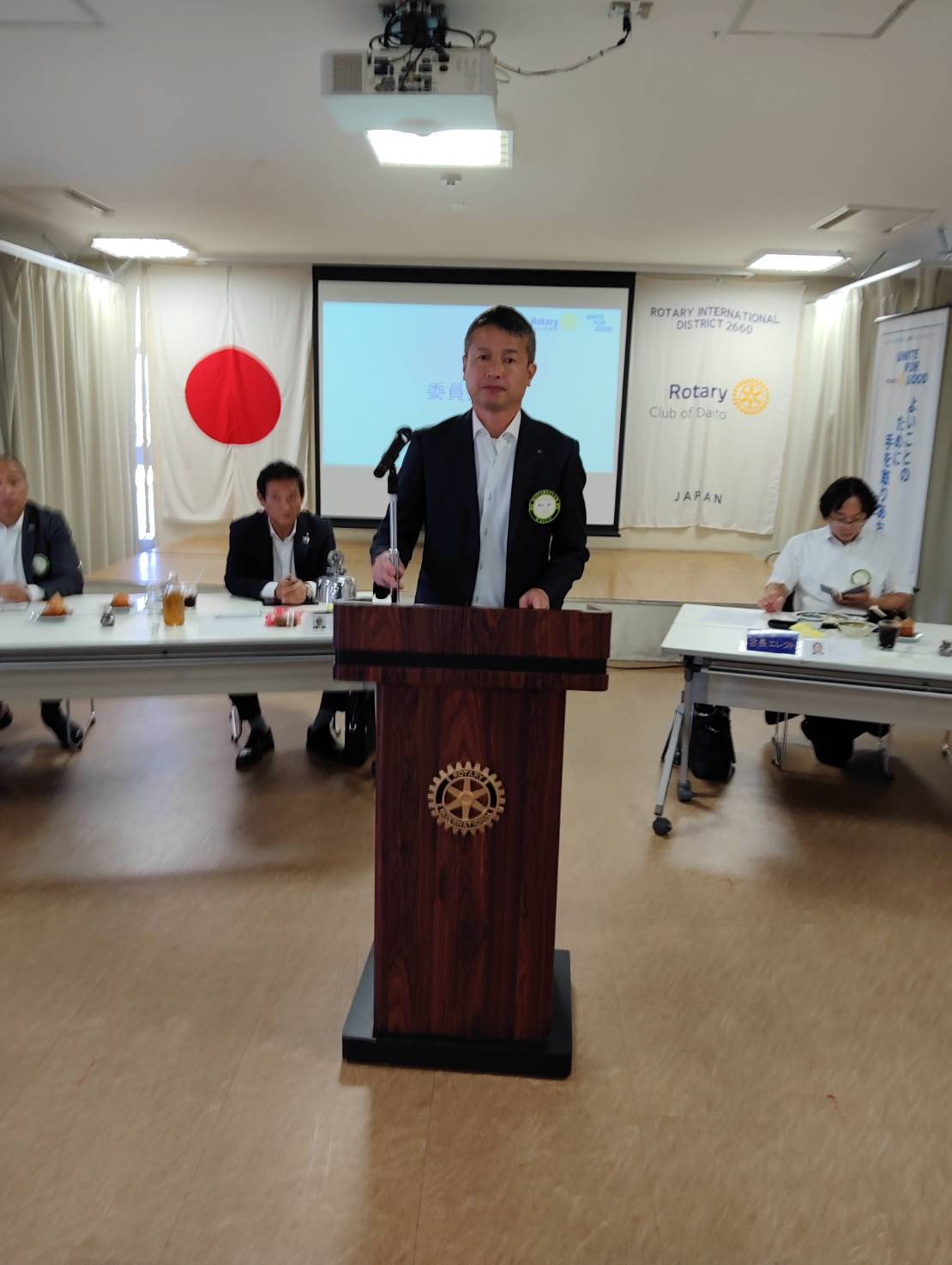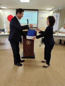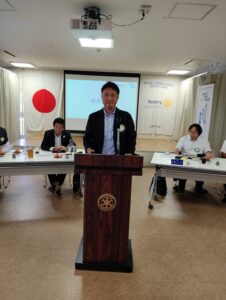皆様こんにちは!2週間ぶりの例会となります。本日もご出席いただき、誠にありがとうございます。さて早速ではございますが、本日は当クラブにおきまして大きな節目の日となります。58年間、当クラブは男性会員のみで構成され歴史を重ねて参りました。本日は、呉本さおり様が初の女性会員として入会されます。ロータリークラブは永遠の課題である会員を増やし、ともに地域社会の発展を願い奉仕するため「会員はクラブにとっての宝」であります。ジェンダー平等を実現すべく、呉本さおり様には女性会員の第一人者として門扉を開き頑張って頂ければと思います。また会員皆様におかれましては、多様性・公平性を尊重しながら温かくお迎え頂き、ご理解とご協力の程宜しくお願い申しあげます。後程、入会式を致したいと思いますので、宜しくお願い致します。